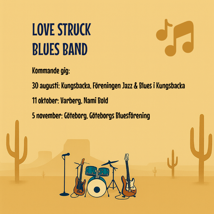 Ett tremannaband som spelar varje spelning som om det vore deras sista – med ett tryck och en närvaro som känns i hela kroppen. Love Struck Blues Band har funnits sedan 2024 och har snabbt tagit västkusten med storm. De spelar tung, svängig blues inspirerad av Texas-legender som Stevie Ray Vaughan.